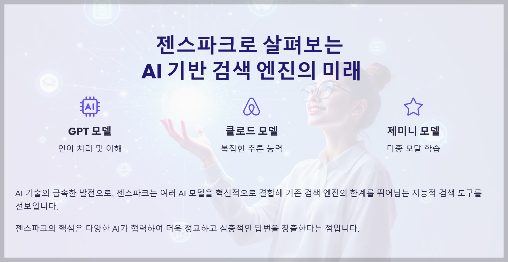 젠스파크는 GPT, Claude, Gemini 등 서로 다른 AI 모델의 기능을 결합하여, 풍부하고 정확한 검색 결과를 만들어내는 것이 특징입니다.
