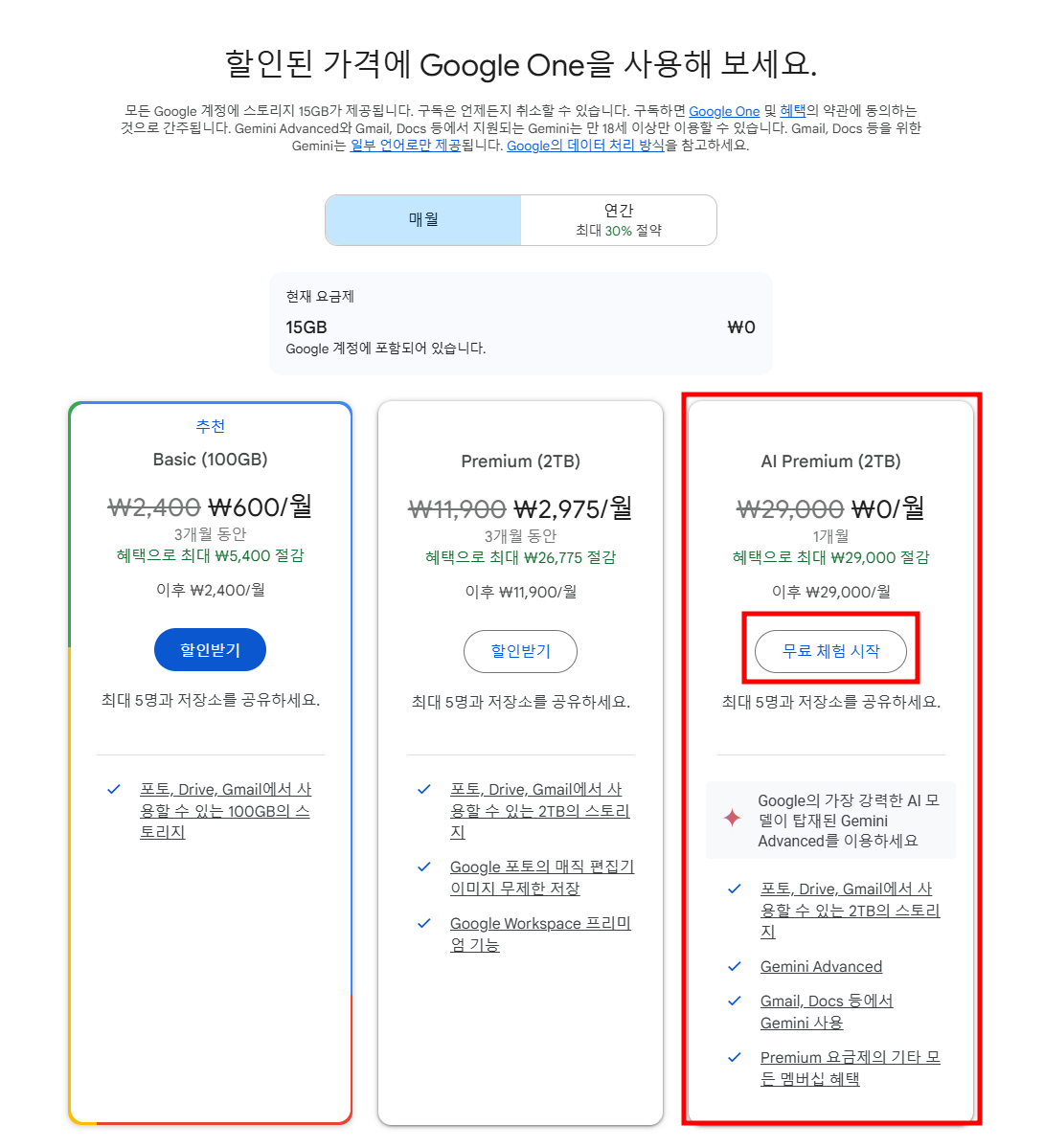 Gemini Advanced = Google One AI 프리미엄 요금제 (월 29,000원)